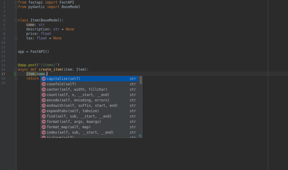 편집기에서, 함수 내에서 타입 힌트와 완성을 어디서나 (만약 Pydantic model 대신에 dict을 받을 경우 나타나지 않을 수 있습니다) 받을 수 있습니다: